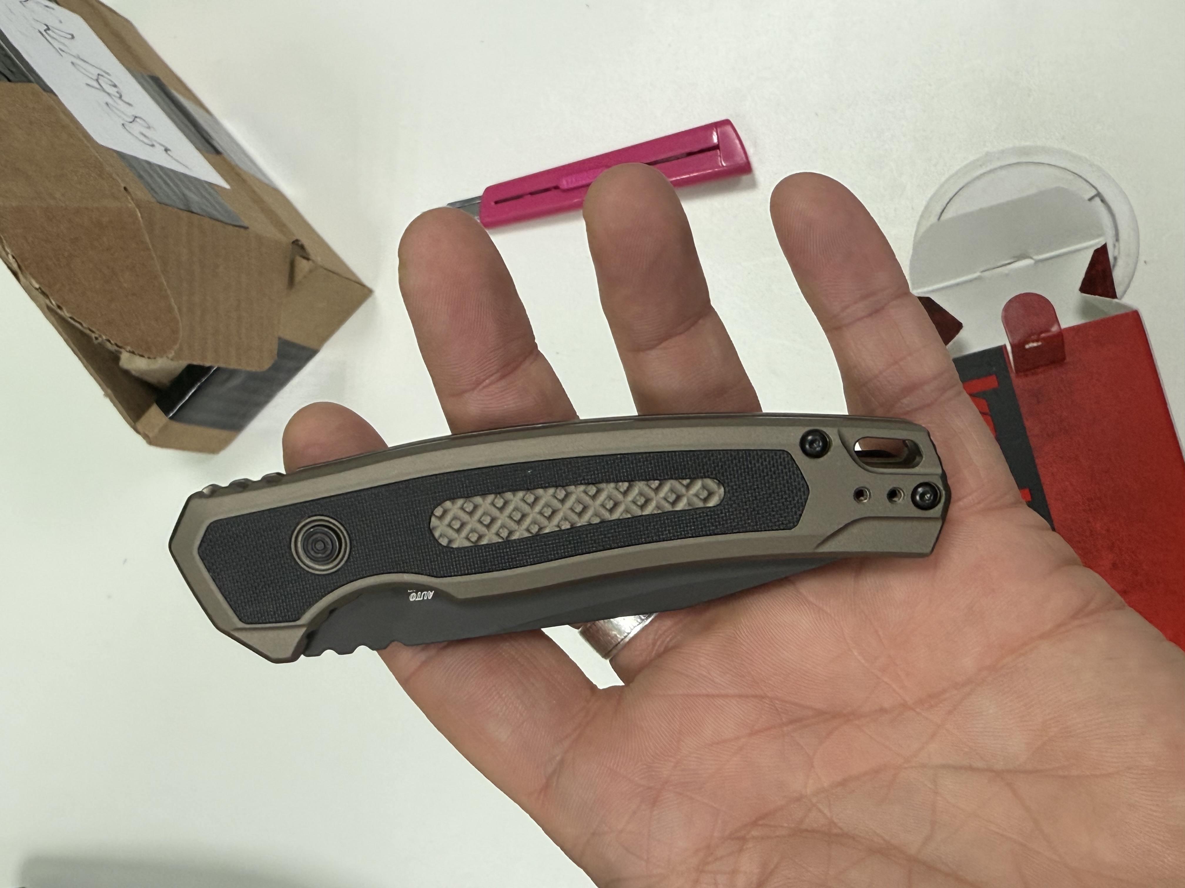 Нож великолепен! Идеальная подгонка, автомат просто бомба! Бреет! цвет просто нереальный, при разном освещении разный оттенок , медный и хаки!!!..